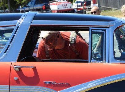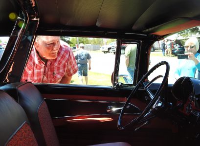- News Photo by Julie Riddle A visitor peers into the window of a gleaming classic car at the 2021 Presque Isle Harbor Wooden Boat Show on Saturday.