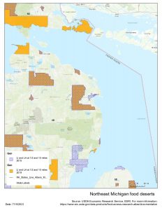 The USDA’s map shows four so-called “food deserts” — low-income U.S. Census Bureau tracts where at least a third of the population lives at least a half-mile from a supermarket — in Northeast Michigan:
