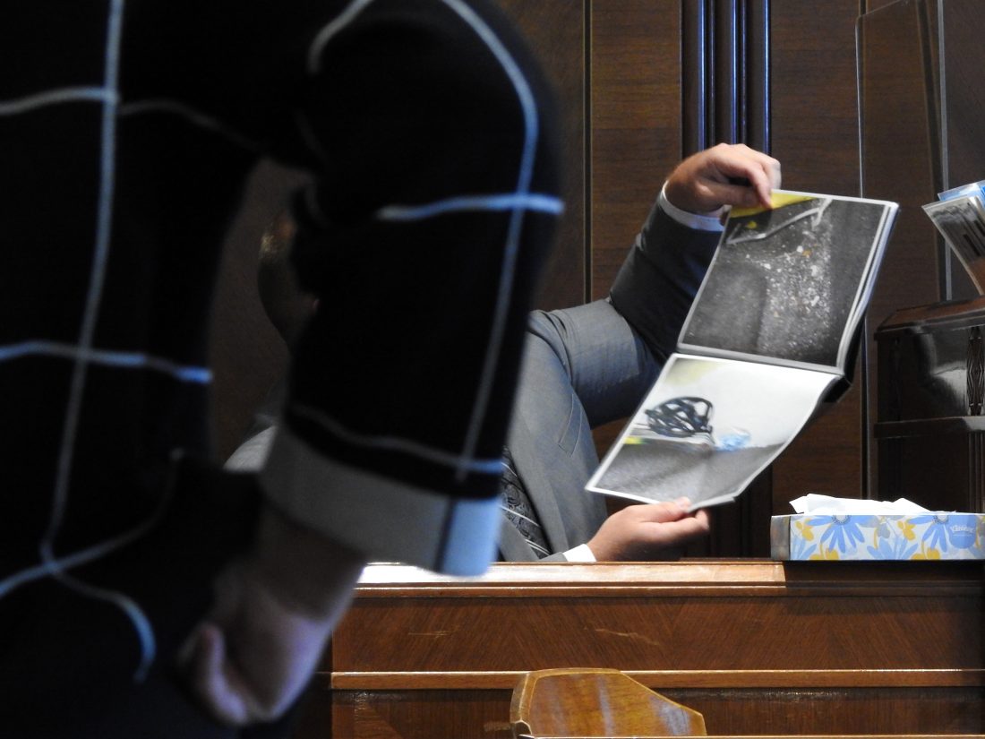 News Photo by Julie Riddle An undercover officer shows a jury a photo of crystals suspected to be methamphetamine during a trial in Alpena’s 26th Circuit Court on Wednesday.