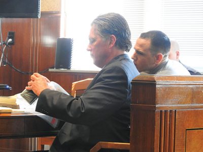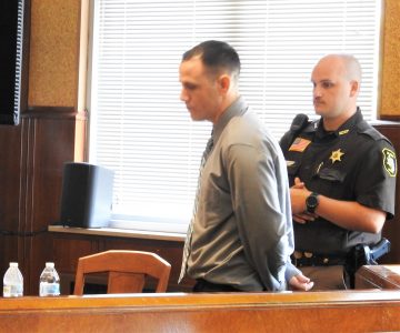 News Photo by Julie Riddle Joshua Carr, convicted on Wednesday of attempted drug distribution, stands with an Alpena County Sheriff’s Office deputy in Alpena’s 26th Circuit Court.