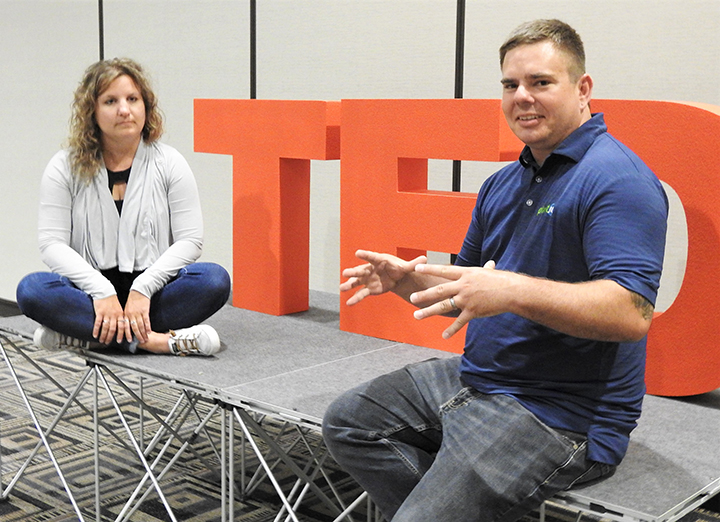 News Photo by Julie Riddle At the APlex on Thursday, Dustin Black, right, discusses an upcoming TEDx event with event master of ceremonies Jackie Krawczak.