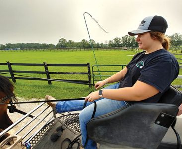 News Photo by James Andersen McKenna Nye holds the lines as she drives a two-horse cart during a recent morning at Glenview Clydesdales in Harrisville. At 21 years old, Nye is already a decorated exhibitor and can drive up to an eight-horse hitch.