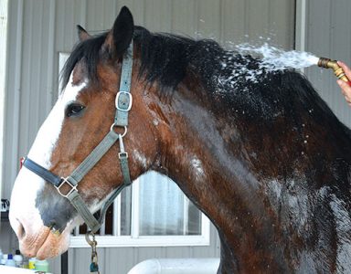 - News Photo by James Andersen One of Glenview Clydesdales’ horses gets a bath after a recent morning trot. Glenview’s horses are washed, dried and oiled after they are done getting daily exercise.