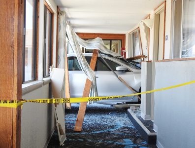 News Photo by Julie Riddle A car straddles a hallway after it crashed into the Alpena Days Inn on Friday.