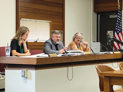 News Photo by Alyssa Ochss Alpena Public Schools Board of Education Trustee Eric Lawson, middle, speaks during the board meeting
