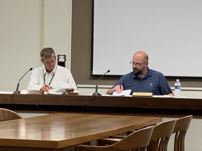 - News Photo by Alyssa Ochss Alpena Public Schools Superintendent Dave Rabbideau and Board of Education President Ned Heath listen during a board meeting on Monday.