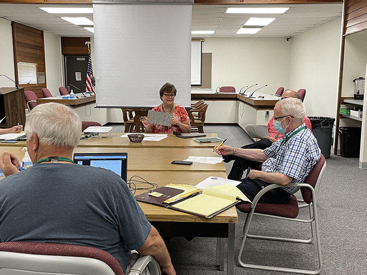 News Photo by Crystal Nelson Alpena Public Schools Associate Superintendent for Business and Operations Mary Lyon shows board members Tom Hilberg, Treasurer Gordon Snow and President Ned Heath during a special board meeting Tuesday what the new tile for Ella White Elementary School will look like.