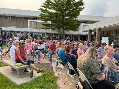 News Photo by Crystal Nelson Attendees of Alpena Public Schools town hall meeting listen to district officials Tuesday in the high school’s front oval.