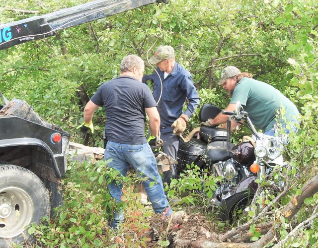 News Photo by Julie Riddle Workers prepare to extricate a damaged motorcycle from apple trees near Bolton Road north of Melville Road in Alpena Township on Sunday afternoon.