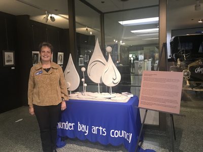 - News Photo by Darby Hinkley Thunder Bay Arts President Ann Diamond poses next to a 3D rendering of the next planned sculpture in the Alpena Art Vision project along the Alpena Bi-Path.