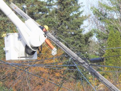 - News Photo by Julie Riddle An Alpena Power Company worker responds to downed power lines on U.S.-23 North on Tuesday.