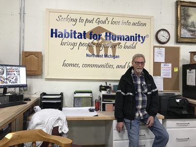 - Above, Habitat for Humanity ReStore Manager Les Ellerhorst leans on the counter at the new ReStore in front of a sign that says, “Seeking to put God’s love into action Habitat for Humanity brings people together to build Northeast Michigan homes, communities, and hope.”