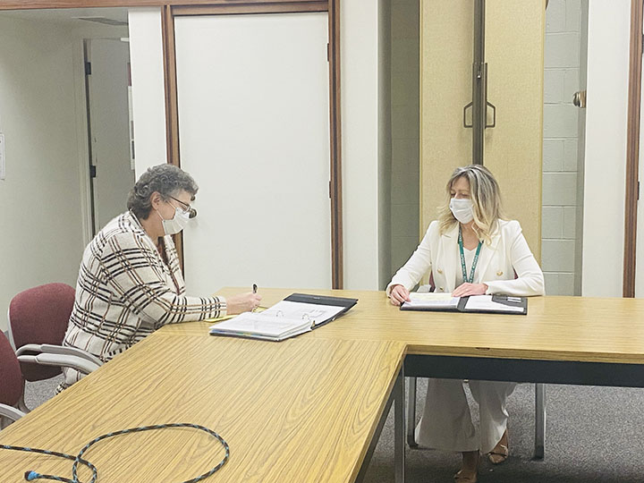 News Photo by Barbara Woodham Leslie Reynolds, left, administrative assistant and secretary to the Alpena Public Schools Board of Education, and Susan Wooden, interim executive director of human resources and labor relations for the district, sit in the boardroom after a board Policy Committee meeting on Tuesday.