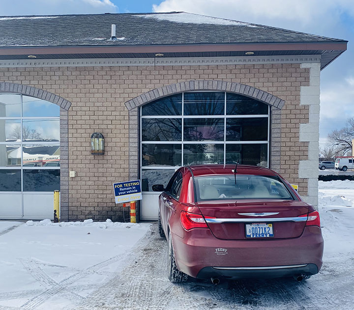 Patients with a pre-arranged appointment, pull up to the garage doors and drive through for testing, while remaining in their vehicles.
