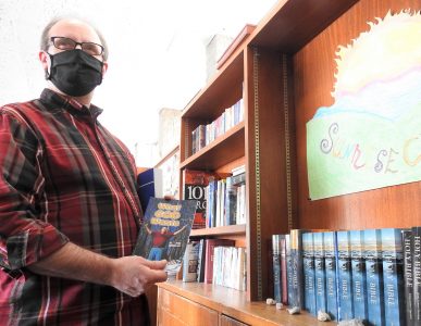 News Photo by Julie Riddle Sean McDaniels, residential technical supervisor at the Sunrise Centre in Alpena, holds a book authored by Bible study leader Mike Cornelius at the center on Tuesday.
