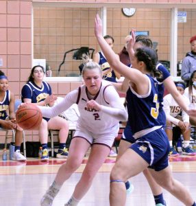 ACC’s Allie DeRocher attempts to drive the baseline during a women’s basketball game in January against Schoolcraft at Park Arena.