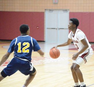 ACC’s James Williams sets up the Lumberjacks’ offense during a men’s basketball game on Wednesday against Schoolcraft at Park Arena.