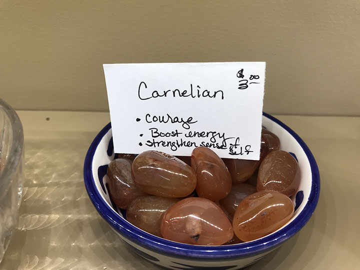 As another example, the deep orange carnelian is meant to bolster courage, boost energy, and strengthen sense of self.
