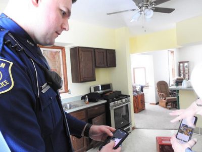 News Photo by Julie Riddle Trooper Jake Strong, of the Michigan State Police-Alpena Post, scrolls through photos of the fire that endangered two Spruce residents in September.