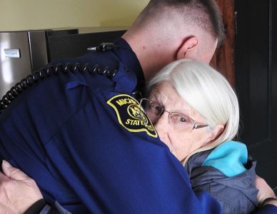 News Photo by Julie Riddle Spruce resident Rhonda Smith, right, hugs Trooper Jake Strong, who rescued Smith and her husband from a house fire in September.
