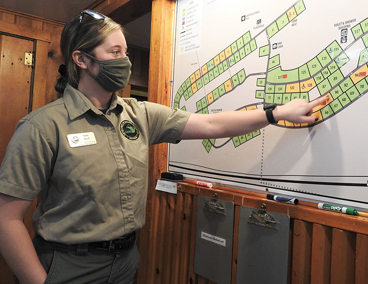 News File Photo Sam Freel, park officer at Hoeft State Park, points out recently upgraded campsites on a map at the park’s campground in this March 2021 News archive photo.