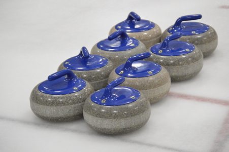 News Photo by James Andersen A group of curling stones is seen before a curling match in Alpena. The stones each weigh more than 40 pounds and are thrown from a starting block known as a hack.