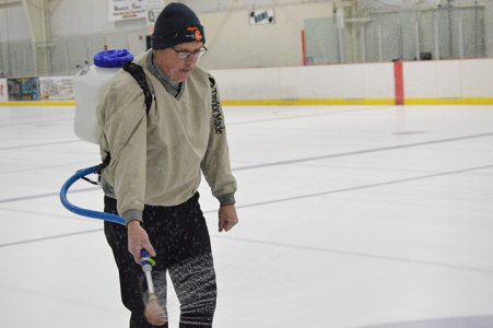 News Photo by James Andersen Mike Wojda preps the ice with a pebbler before a recent curling match. The backpack-like device is used to texture smooth ice with hot water droplets, which creates a coat of pebbles to raise curling stones off the ice surface. The pebbles are then either cut or smashed to create a surface for stones to sit on.