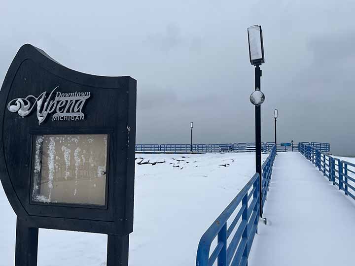 News Photo by Steve Schulwitz Snow covers the breakwall at the harbor in Alpena on Monday afternoon. Later in the day, the Alpena Municipal Council voted to have new lights installed on the breakwall as well as in other areas of the city.