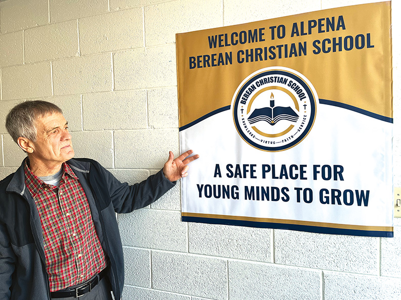 - News Photo by Steve Schulwitz Mark Kuczma, spokesman for the new Berean Christian School in Alpena, shows off one of the banners for the school, which may open in the fall. The goal of the school is to provide an educational alternative to public education.