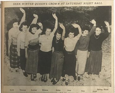 News Archive Photo The Alpena News’ Jan. 12, 1953 edition announces the ice empress and her court. From left to right are Jane Kennedy, Helen Ellsworth, Audrey Mark, Sybil Rondeau, Ice Empress Joan Ferris, Therese Munroe, Evonne Cripps, Anne Maddox, and Betty Lancaster.