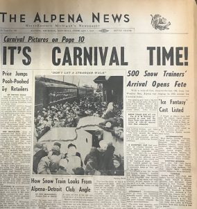 - News Archive Photo The Alpena News’ Feb. 7, 1953 front page announces the carnival and shows a photo of a large crowd of people boarding the Snow Train from Detroit to Alpena.