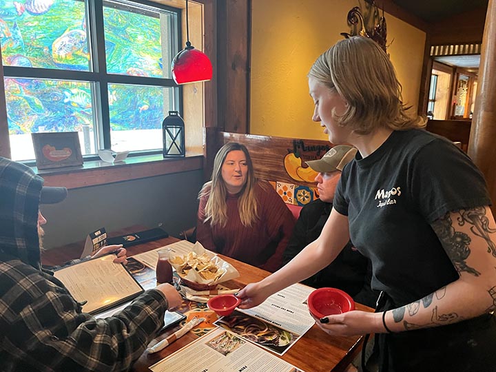 News Photo by Steve Schulwitz Zoe Boyle, serves up some tortilla chips and salsa to a table of customers who are having lunch at Mango’s Tequila Bar in Alpena. Mango’s offers outdoor dining in the warmer months. The City of Alpena could amend its zoning ordinance to more closely regulate outdoor dining to make sure customers and pedestrians remain safe when space is limited.