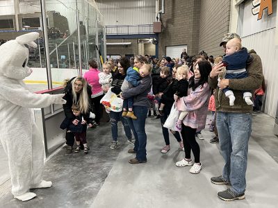 News Photo by Steve Schulwitz The Easter Bunny visits with families from Alpena before the start of the annual Easter egg hunt at the Northern Lights Arena. The event was canceled the last two years because of the COVID-19 pandemic.