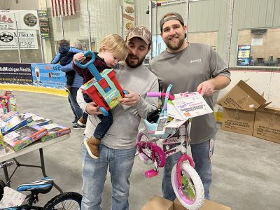 News Photo by Steve Schulwitz Jonny Zawacki, right, presents a bike to a lucky winner during the Easter egg hunt in Alpena on Saturday. Hundreds of families from the area filled the arena to enjoy the fun.
