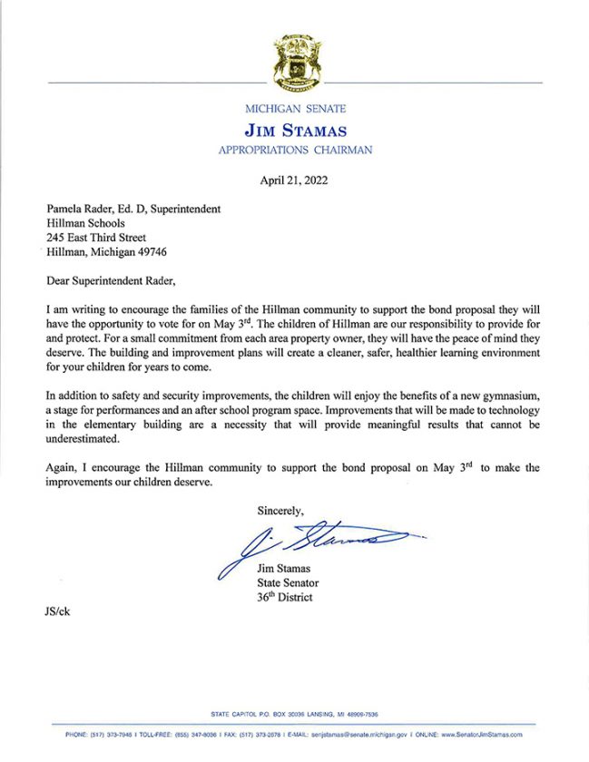 HILLMAN — Hillman Community Schools on Thursday received a vote of support for an upcoming bond proposal in the form of a letter from Senator Jim Stamas, R-Midland.