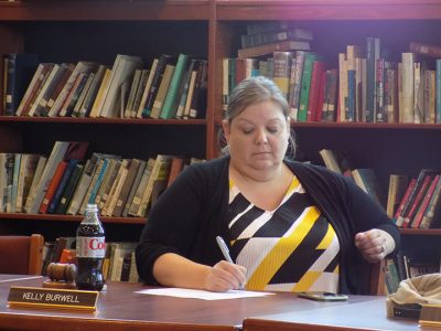 News Photo by Charles Madison Kelly Burwell, president of the Hillman Community Schools Board of Education, listens to a presentation at a recent school board meeting in Hillman.