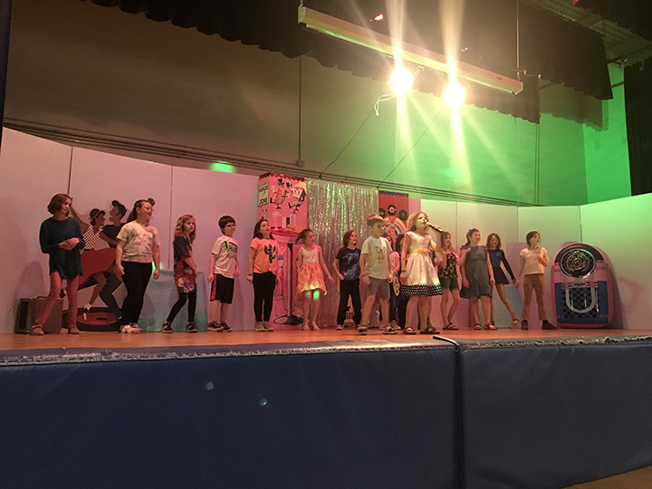 News Photo by Darby Hinkley Fifty-three students at Ella White Elementary School participated in a Star Variety Show on Thursday afternoon, emceed by Harmony Daoust and Loralei Durfee. Above, a group of students sing and dance in the first showing, at 12:45 p.m. The second showing followed at 1:45 p.m.