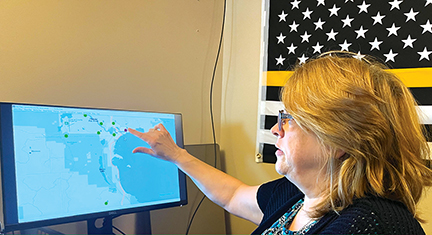 News Photo by Steve Schulwitz Alpena County Emergency Services Coordinator and 911 Director Kim Elkie shows the locations of eight emergency sirens that warn residents of impending emergencies, including severe weather. She said the sirens are only one way the county passes along information to help keep them safe.