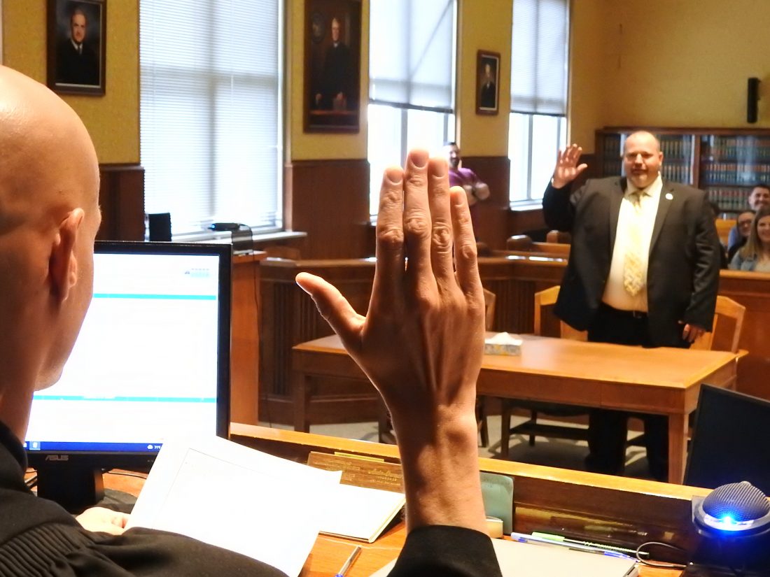 News Photo by Julie Riddle Judge Ed Black, left, faces new Alpena County Sheriff Erik Smith in the Alpena County Courthouse on Friday. Following Smith’s swearing-in ceremony, Ed insisted that photographers join him in the front of the courtroom while he reenacted the ceremony to place the emphasis on Smith. “He’s the important one,” Black said.