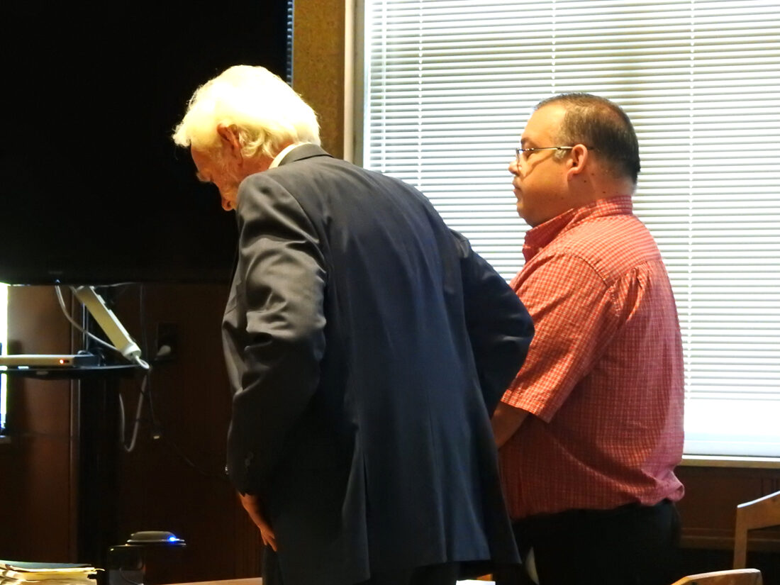 News Photo by Julie Riddle Bradley Avery, right, and attorney Dan White listen as jurors hand down a guilty verdict in Alpena’s 26th Circuit Court on Thursday.