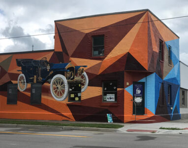 Canadian artist Tim Nijenhuis last week completed the newest mural in Downtown Alpena’s Fresh Waves Mural Project. It features shades of blue, orange, and brown geometrical shapes, and a realistic painting of the Alpena Flyer. The mural wraps around the side of the Light of Hope Clubhouse building.