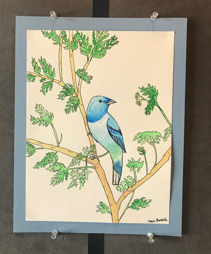 Her third piece is a watercolor of an indigo bunting on a branch, which can be seen in the photo above.