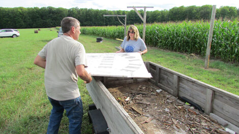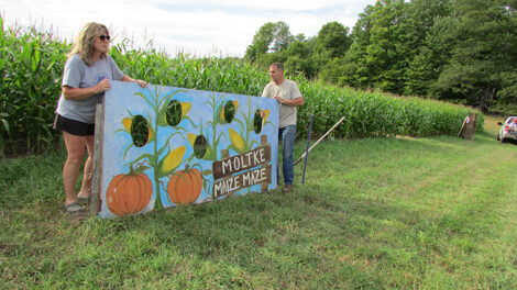 - News Photo by Justin A. Hinkley Scott Brege, left, and Heidi Tulgestke move a sign as the family readies the Moltke Maize Maze recently at the family farm northwest of Rogers City.