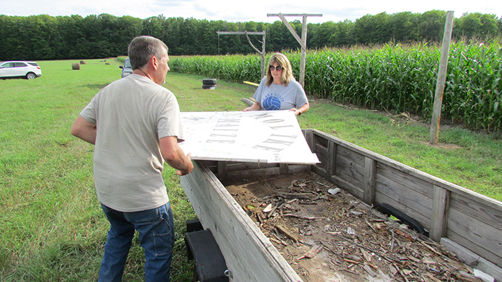 News Photo by Justin A. Hinkley Heidi Tulgestke, left, and Scott Brege move a sign with holes cut in it for families to take pictures with as the family readies the Moltke Maize Maze recently at the family farm northwest of Rogers City.