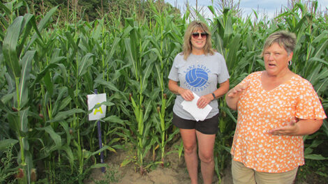 News Photo by Justin A. Hinkley Heid Tulgestke, left, and Shannon Brege recently discuss the three levels of challenges inside the Moltke Maize Maze at the family farm northwest of Rogers City.