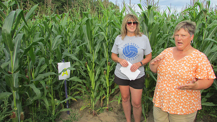 - News Photo by Justin A. Hinkley Heid Tulgestke, left, and Shannon Brege recently discuss the three levels of challenges inside the Moltke Maize Maze at the family farm northwest of Rogers City.