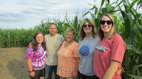 - News Photo by Justin A. Hinkley From left to right, Mary Brege, Scott Brege, Shannon Brege, Heidi Tulgestke and Jena Grulke pose recently inside the Moltke Maize Maze at the family farm northwest of Rogers City.