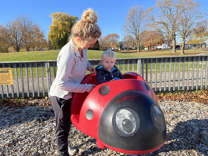 News Photo by Steve Schulwitz Molly MacArthur, left, helps settle Clay Story into one of the playground toys at Kiwanis Kiddie Park in Alpena on Tuesday. Temperatures in Alpena were in the mid 60s on Tuesday and forecasts call for mild weather the rest of the week.