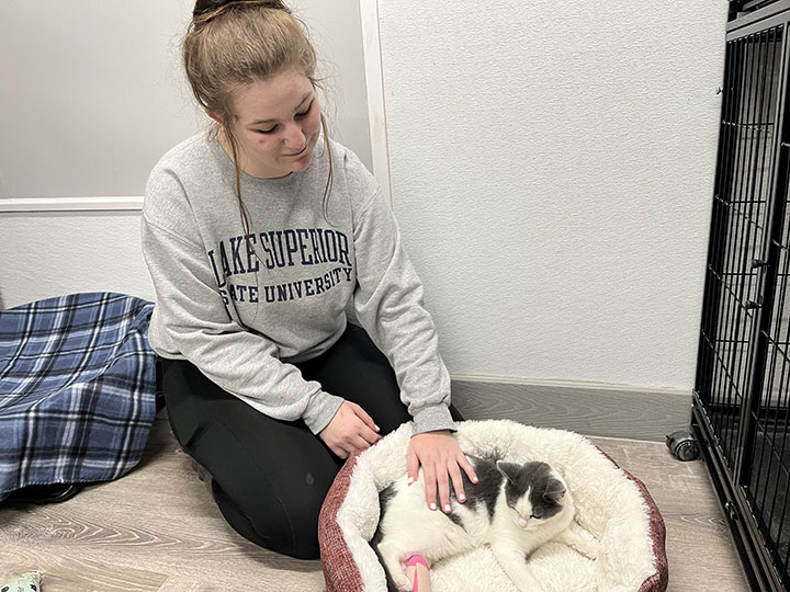 Last year, Alpena Community College’s Manufacturing Technology Club finished their project to improve the doors on the Humane Society’s dog kennels, remodeled the canine storeroom, and installed new glass-front doors in the cat playrooms that allow natural light into the rooms and help stimulate cats in the winter, when they can’t access the catio spaces.