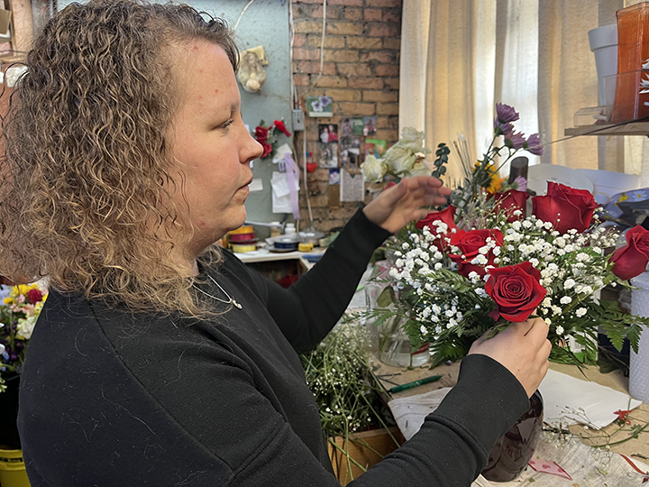 News Photo by Steve Schulwitz Lasting Expressions Manager Tara Wilson puts the finishing touches on a vase full of red roses that will make someone happy on Valentine’s Day today. The flower shop was busy Monday as people put their orders to be sure their valentines received their bouquets.